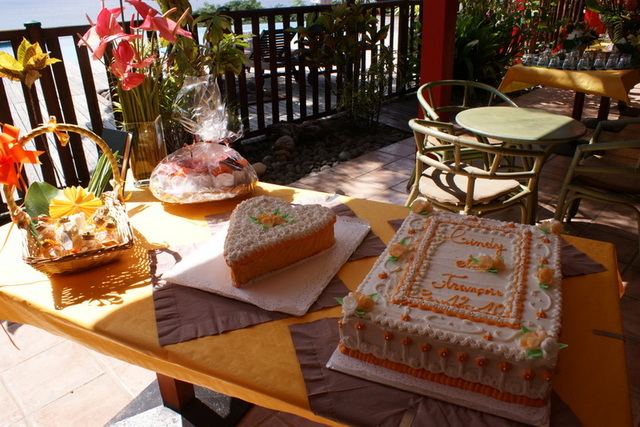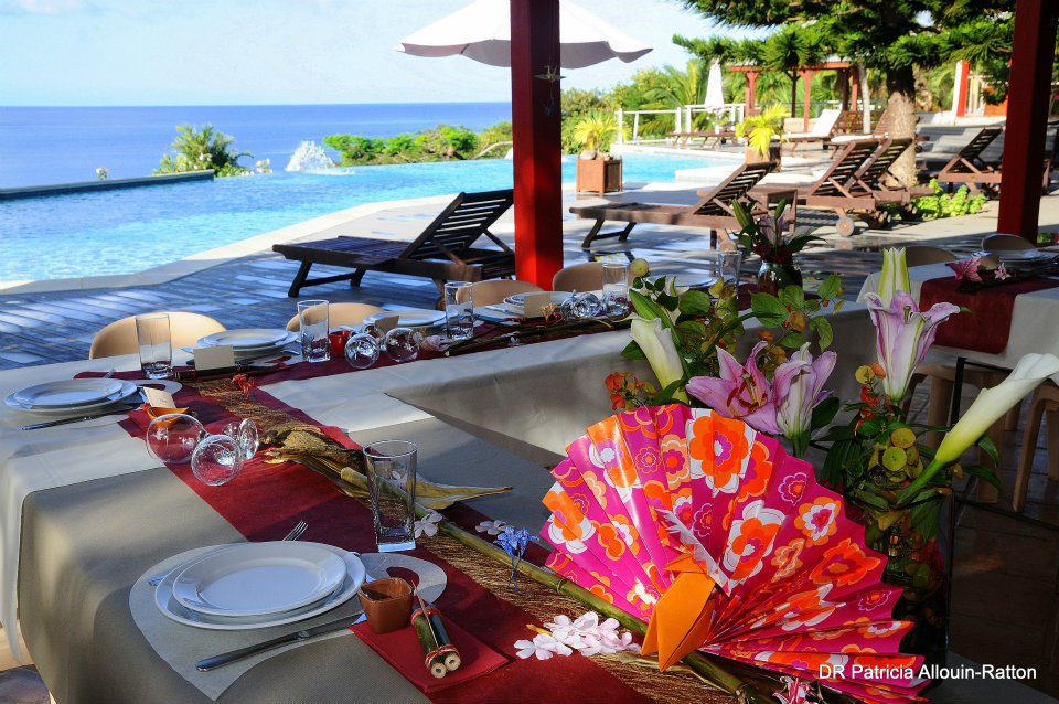 Galerie – Evènements Composition floral exotique Gâteaux et patisseries Décoration de table Buffet apéritif Mariage entrée de l’hôtel***-restaurant Le Rayon Vert